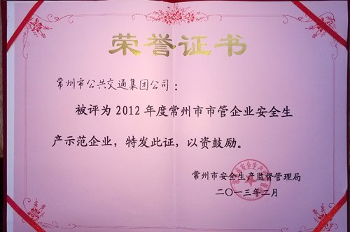 常州公交获2012年度常州市“安全生产示范企业”称号