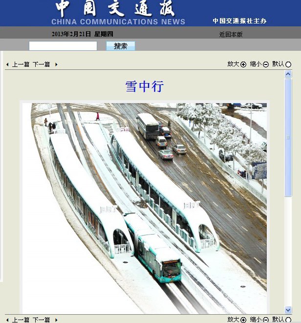 《中国交通报》2月21日头版刊登大幅照片---《雪中行》,报道常州快速公交大雪天保运营。