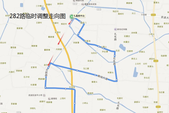 282路:由礼嘉首末站始发,调整行驶礼政路至禹城大道路口后恢复原线路行驶;临时撤销贝庄村道(礼政路—礼毛路)、礼毛路(贝庄村道—禹城大道)、禹城大道(礼毛路—礼政路)行驶路段,同步撤销“王言桥、贝庄头、贝庄村委、上路、阳沿桥、毛家桥、建新桥、禹城”双向停靠站,调整行驶路段临时增设“政平变电所”双向停靠站。